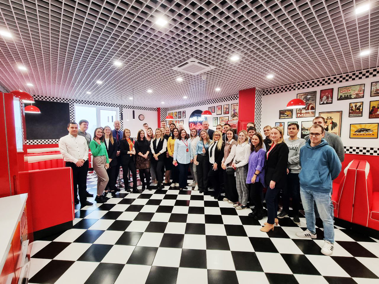 В екатеринбургском офисе компании MEDLIGA открылось собственное кафе и арт-пространство для сотрудников в ретро стиле 50-х годов. Идея появилась пару месяцев назад, а уже сегодня прошло торжественное открытие нового дизайнерского помещения.