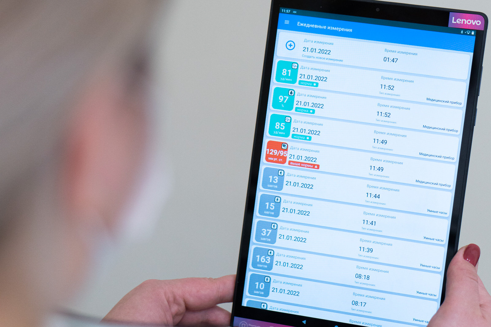Мобильное приложение для пациентов позволяет просматривать, фильтровать данные измерений, предоставляет аналитику по результатам, в том числе в виде графиков и диаграмм для каждого измеряемого показателя. В приложении отображается информация об установленных врачом границах норм, а для измеряемых показателей разработана цветовая индикация в соответствии с диапазонами норм.