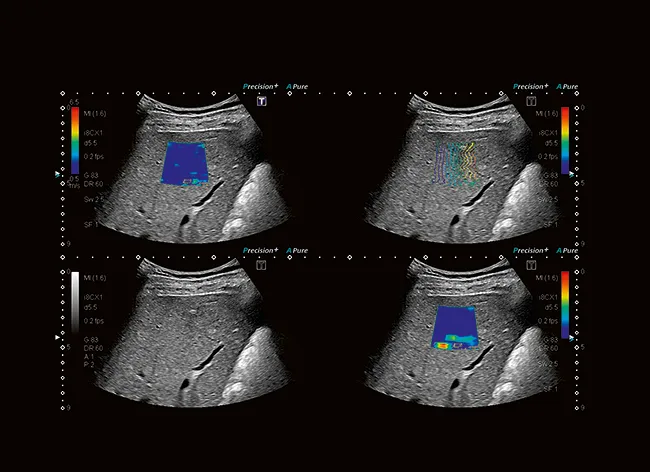 Визуализация с затуханием позволяет визуализировать и измерять коэффициент затухания жировой ткани печени. Усовершенствованные фильтры удаляют из результатов измерения такие структуры, как сосуды и кальцификации, что обеспечивает надежные результаты.