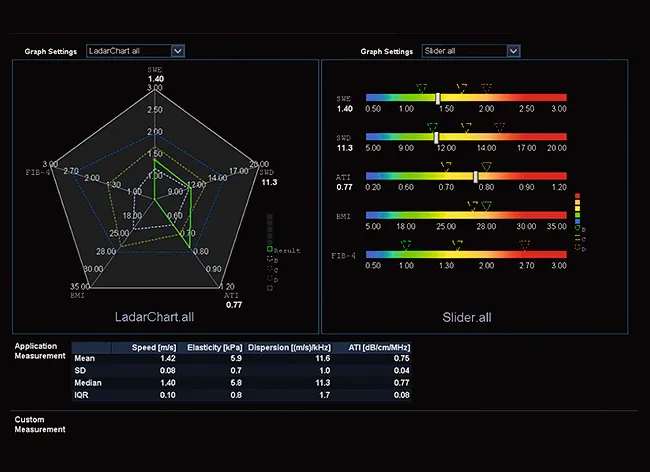 Встроенный в систему инструмент многопараметрической отчетности для визуализации печени обеспечивает всесторонний обзор для удобного сравнения всех доступных показателей.