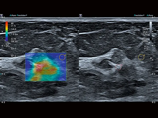 Технология сдвиговых волн Aplio обеспечивает количественное измерение эластичности тканей и отображение ее в режиме реального времени в различных клинических условиях. Интеллектуальные карты помогают визуально оценить распространение и качество эластограммы.